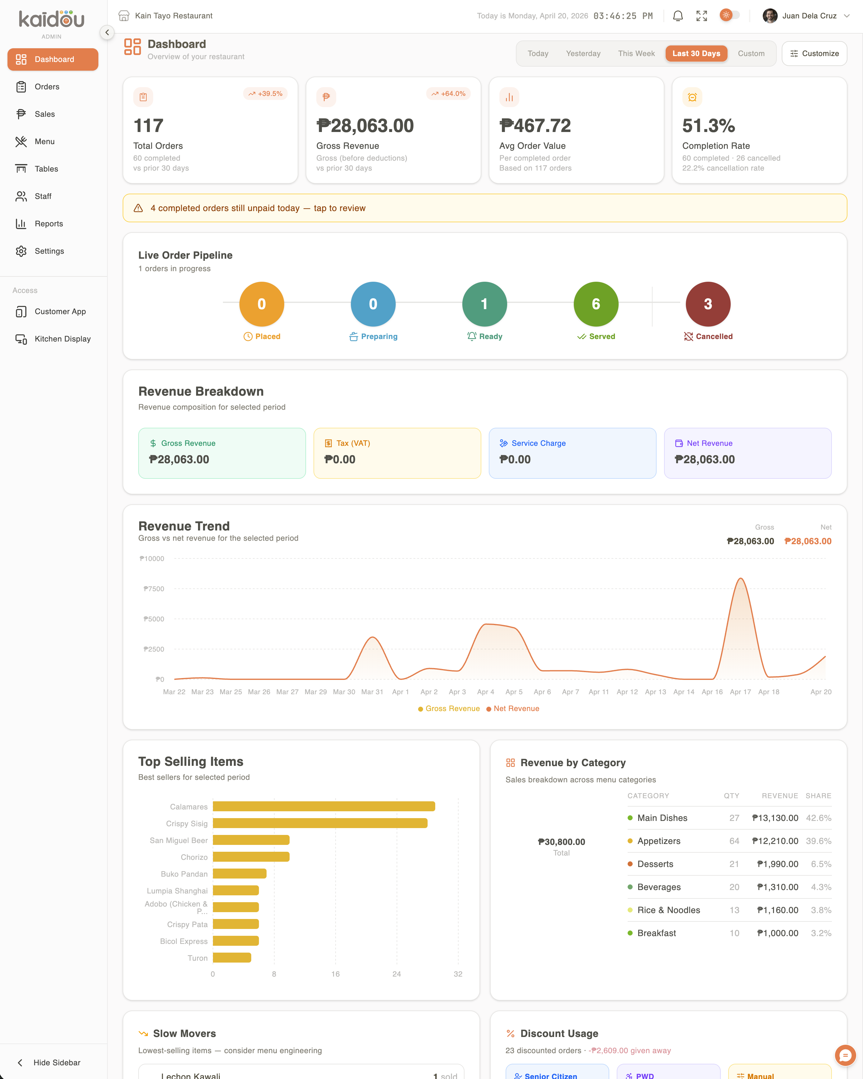 Revenue, peak hours, top sellers, payment split — all updating live as orders flow in.