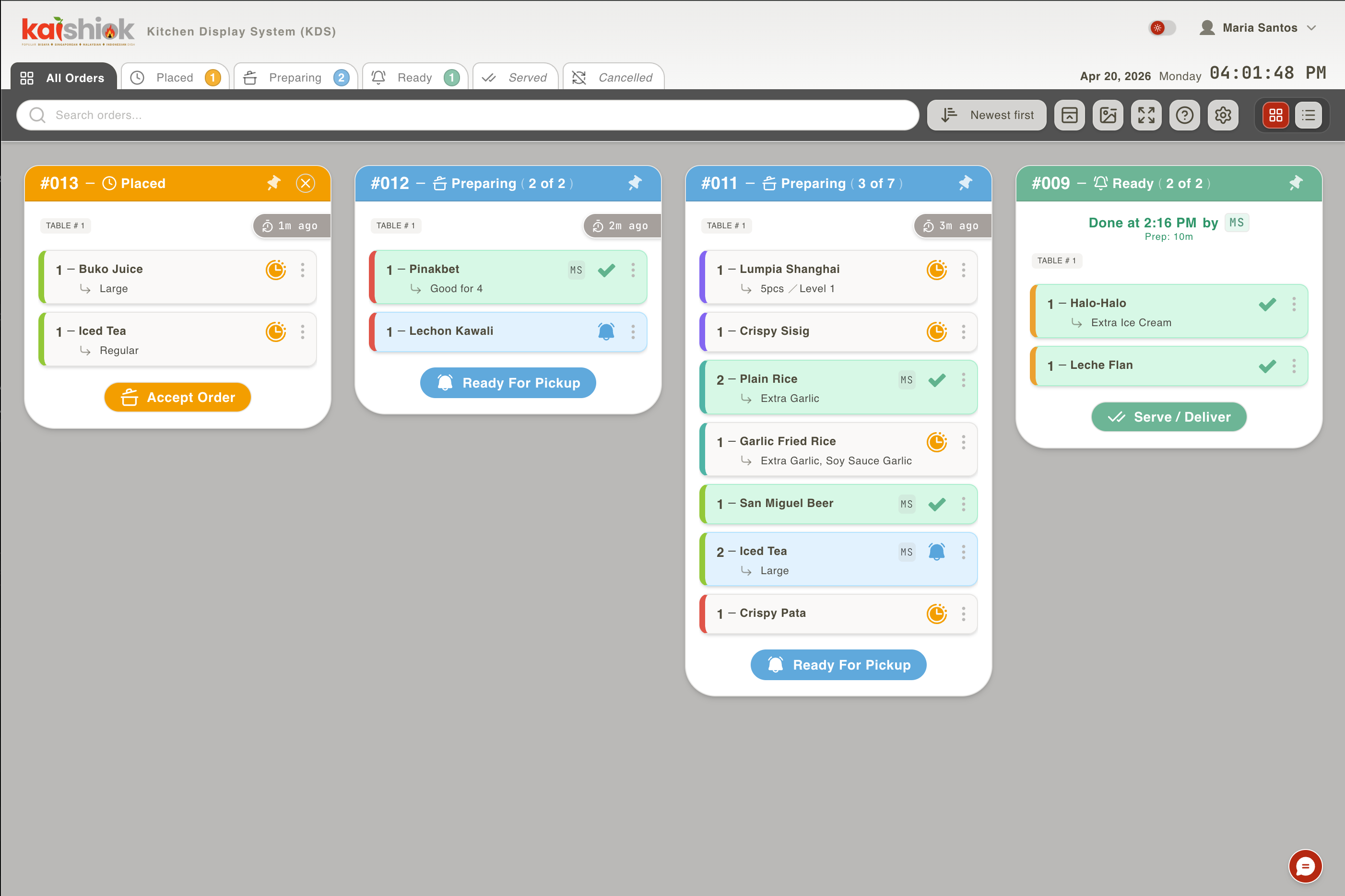 Large-screen KDS for the back-of-house. Color-coded by age, station-grouped, item-level taps.